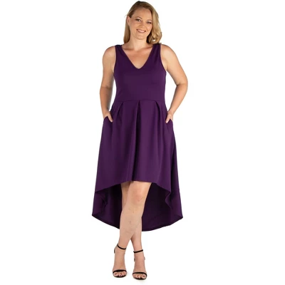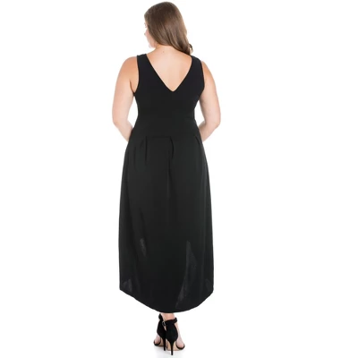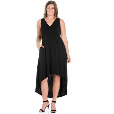 A modern flirty take on the ever classic little black dress. This plus size dress features a V-neckline, a fitted top, and high-low pleated skirt. This lovely dress is not only stylish but is also made from highly comfortable stretch material and has the added feature of side pockets.