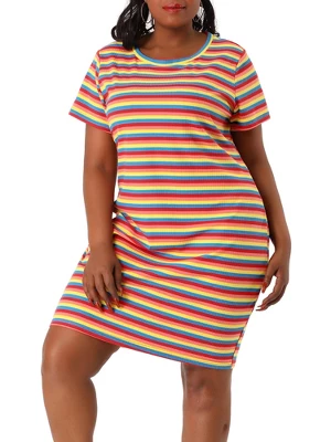 This rainbow-striped short-sleeve dress is a fun and stylish addition to your wardrobe. The fitted design flatters your figure, while the above-the-knee length keeps it playful and comfortable. Made of high-quality stretchy fabric, this dress ensures all-day comfort and mobility. The colorful stripe pattern adds a touch of playfulness, making it perfect for a day out or special occasions. The round neckline is versatile and easy to accessorize, making it easy to pair with different accessories and shoes.