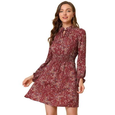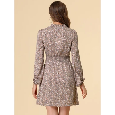 - Ruffled V Neckline, Self-Tie Neck, Floral Pattern, Long Sleeves with Puff Cuffs