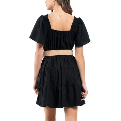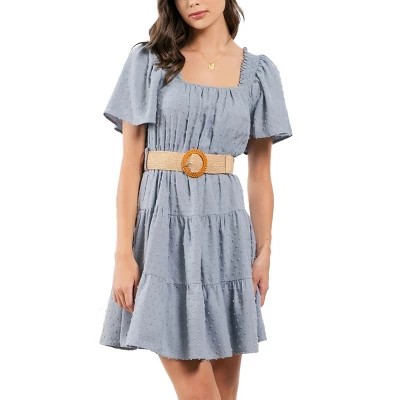 Create memories this upcoming warm season in this short and breezy mini dress from August Sky. It features a square neckline, short flutter sleeves with rushing at the shoulders, it also comes with a belt and the construction of the fabric has an all over textured swiss dot pattern. Pair it with your favorite accessories to complete he look and give it your own personal style.
