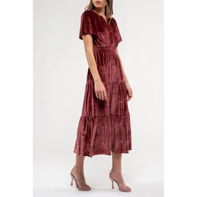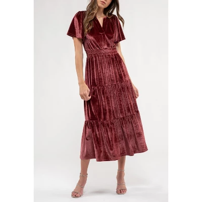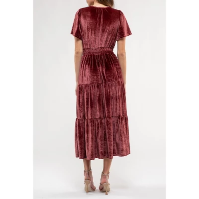 Introducing the August Sky Women’s Velvet Split Neckline Tiered Midi Dress, your go-to choice for holiday elegance. This dress features a captivating split V-neckline that adds a touch of sophistication to your ensemble. Short sleeves offer comfort and style, while elastic around the waistline ensures a flattering fit for all. The tiered skirt design adds depth and flair to this timeless piece, perfect for festive occasions. Unlined for a lightweight feel, it’s crafted from luxurious velvet fabric, exuding opulence with every step. Just add your favorite accessories to complete the look and make a statement during the holiday season. Embrace the spirit of celebration and elegance effortlessly with this dress.