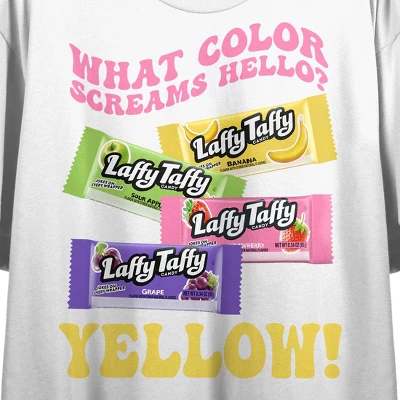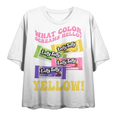 - CUSTOM DESIGN: Four wrapped candies decorate the center of this crop t-shirt while pink and yellow letters spell out a classic Laffy Taffy joke. Fans of the chewy and fruity candy will love this fun custom design.