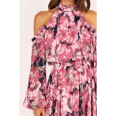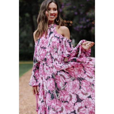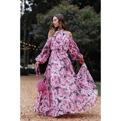 Show your style in this maxi length dress! This beautiful piece features a high neckline, long sleeves with elasticised cuff and an exposed off shoulder design. The elasticised waistband creates the perfect fit and provides you with extra comfort.