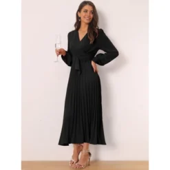 Seta T Women’s Spring Fall Long Lantern Sleeve Wrap V Neck Flowy Ruffle Pleated Midi Dresses
