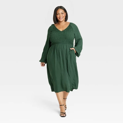 Elevate your outfits with this Balloon Long Sleeve Smocked Midi Bodice Dress from Ava & Viv™. This balloon long-sleeve dress fashioned in a midi length features a flattering V-neck and a smocked bodice for a touch of dressy texture and style. The midweight woven material offers you a comfortable drape, while the pull-on design allows for ease of wear. Complete the look with your choice of footwear and hoop earrings.