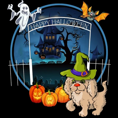 - This cute Halloween design features a puppy in a witch hat in a graveyard surrounded by jack-o-lanterns with a bat and ghost friend flying over the front gate of a haunted house.